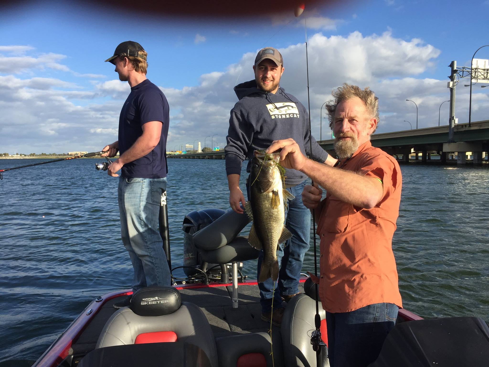 Had the privilege to meet the Khun family for half a day of fun on a recent Bass Fishing Charter and witness the strong bonds and the love in hunting and fishing. Most interesting was Burt, Hunter and Willy were visiting Orlando to support their dad/uncle (Burt) in his annual Tree Climbing Event and bass guided fishing trip in Central Florida. After agreeing to meet at Lake Underhill due to the high winds (30-45 mph), we wasted no time and began our day on the far southwest side and anchored in 15 foot water. Fished the entire water column for about an hour in the safety of the HWY 528 Bridge. Next, we headed across the lake to my favorite spot as the wind seemed to subsided; however, had some difficulty holding in the wild westerly wind even while dragging the anchor through the thick hydrofoil on 100ft rope. We then decided on moving to the northwest side and near the bridge again. As options became limited, I said a silent prayer request for these men and cooperative fish. Coincidence, hmmm, I think not–a few minutes later these men began to catch decent fish and I also became aware this was Hunter’s Kuhn’s Birthday!