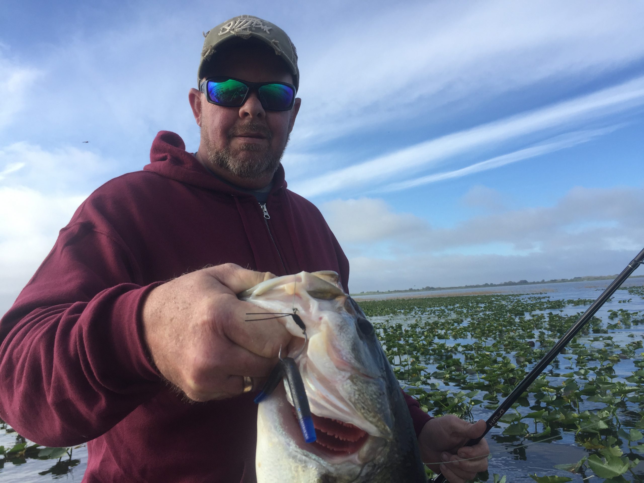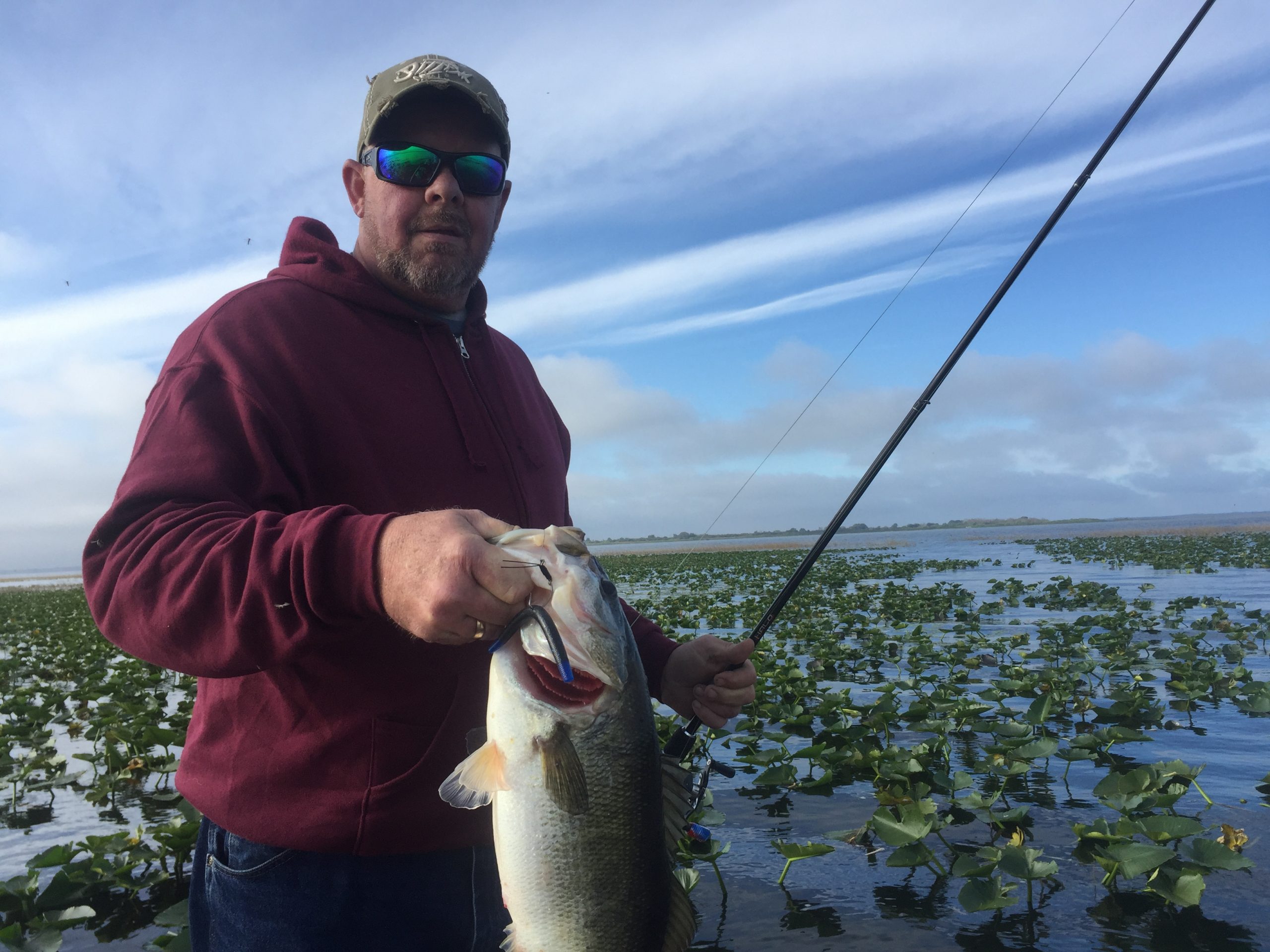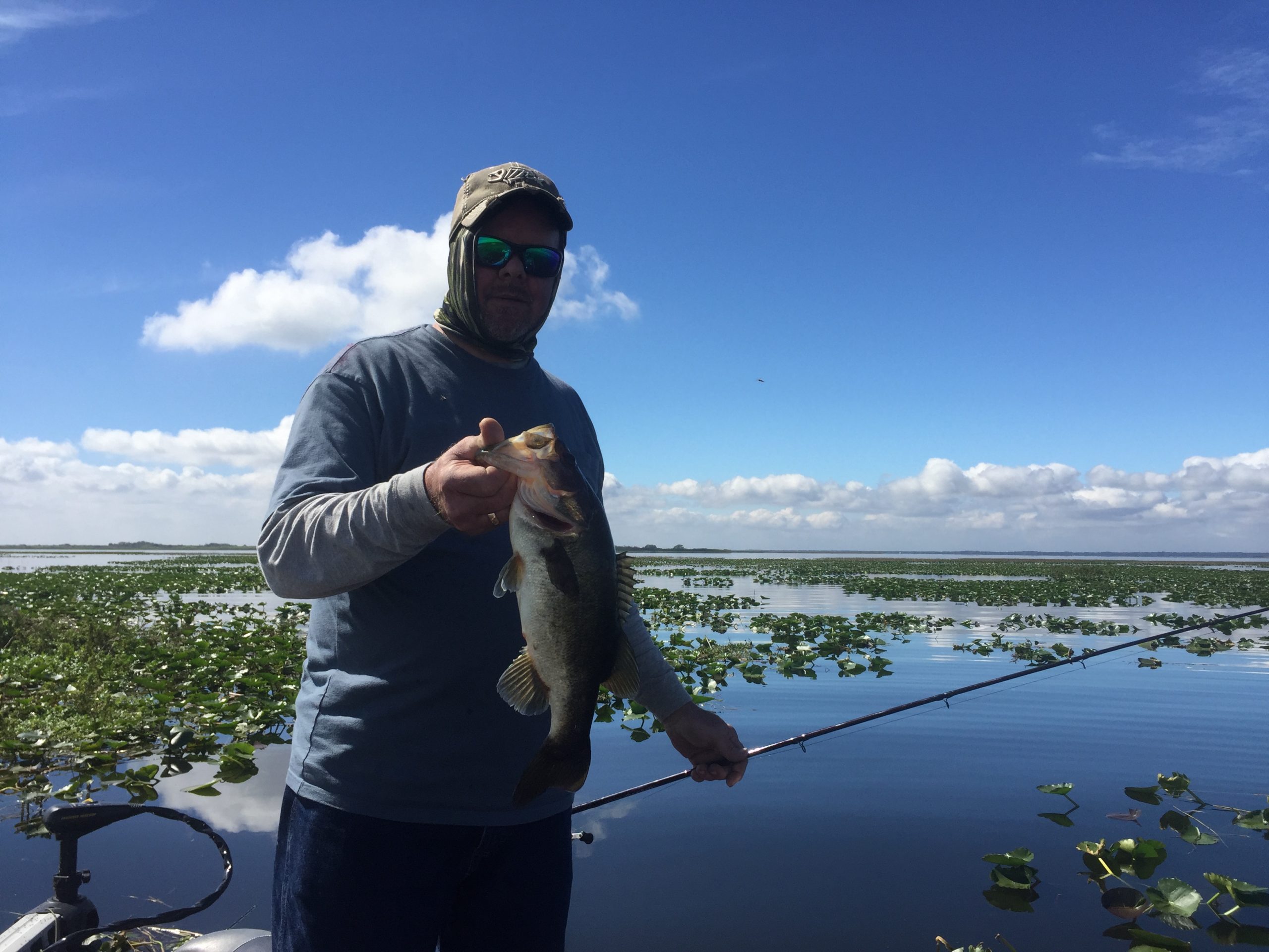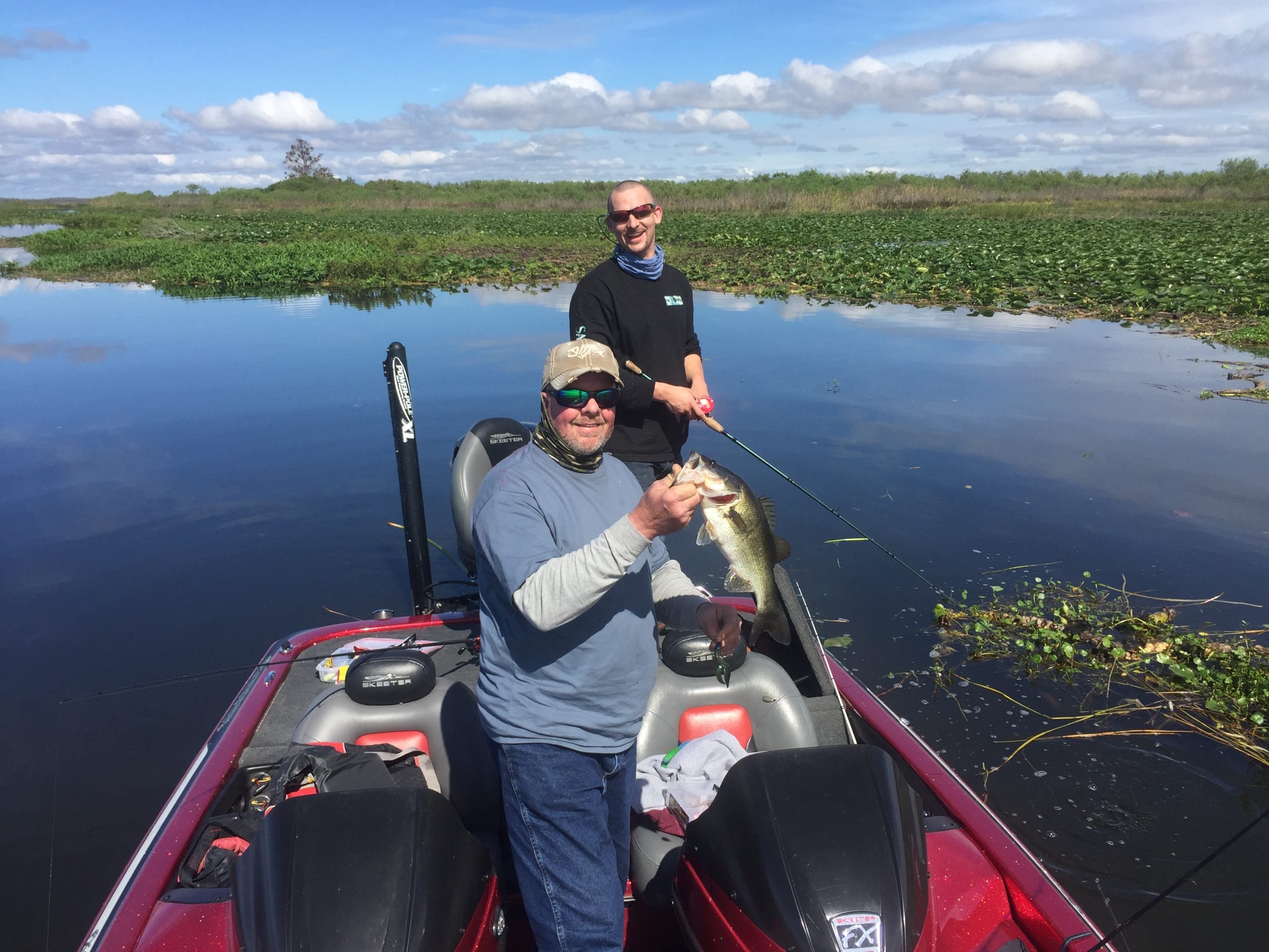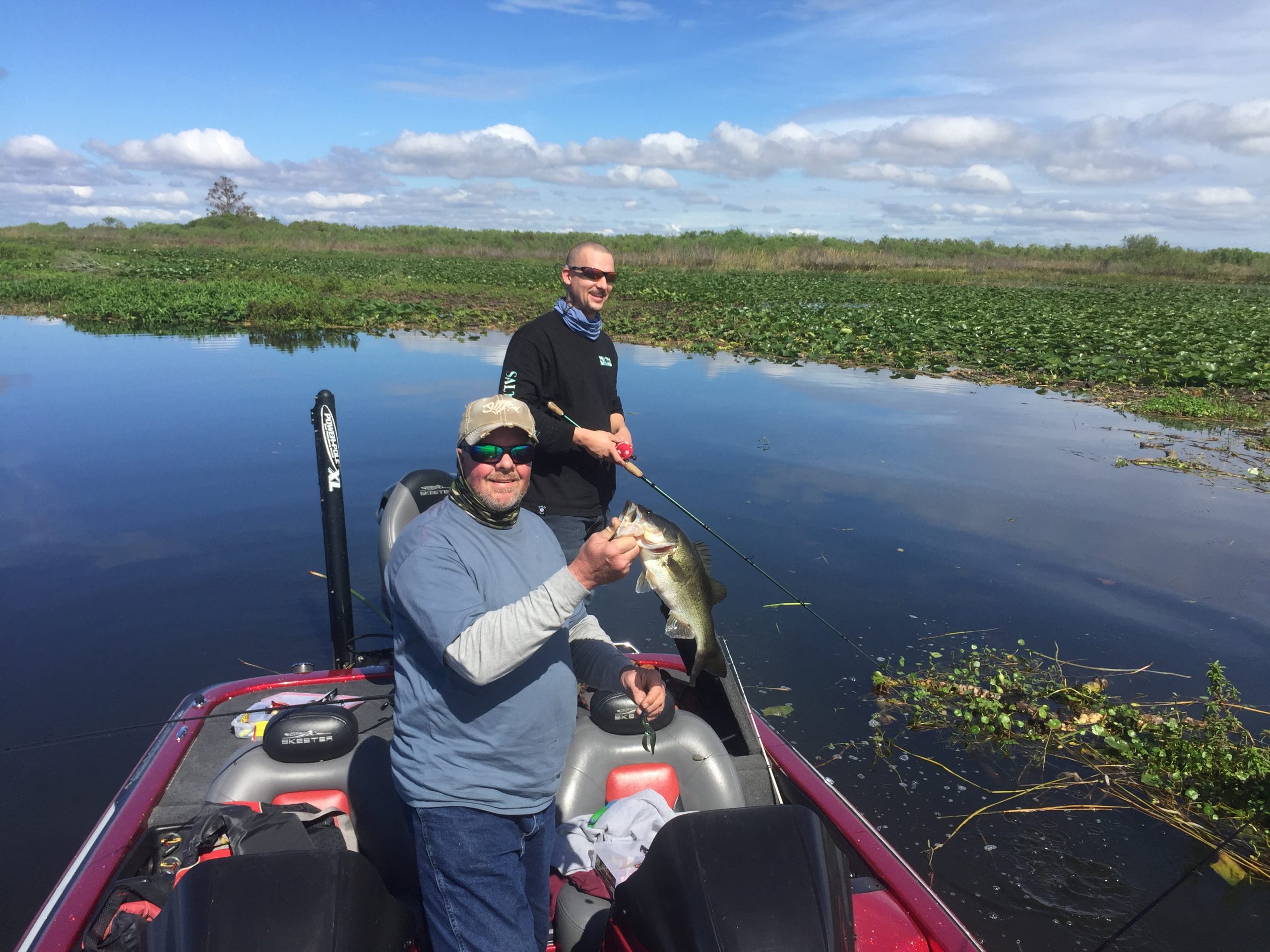Terry and Andrew visiting from Maryland got on board to hunt for lunker bass on the Kissimmee Chain of Lakes, 23 FEB 17. The strategy chosen was artificial lures thrown in Kissimmee Grass and pads by two seasoned east coast tidal water fishermen. Having Georgia roots and years of fishing (BFL, All America), Terry wasted no time in displaying his skill by finding bass just beneath the surface–pitching his bait accurately in the hyacinth and lily pads. He even plucked one male bass off a bed. Success catching bass was met several times throughout the full day excursion and the weather cooperated once again in sunny Florida (post frontal conditions). We hope to see you both again to reel in that dream catch on a Central Florida Bass Charter. Blog